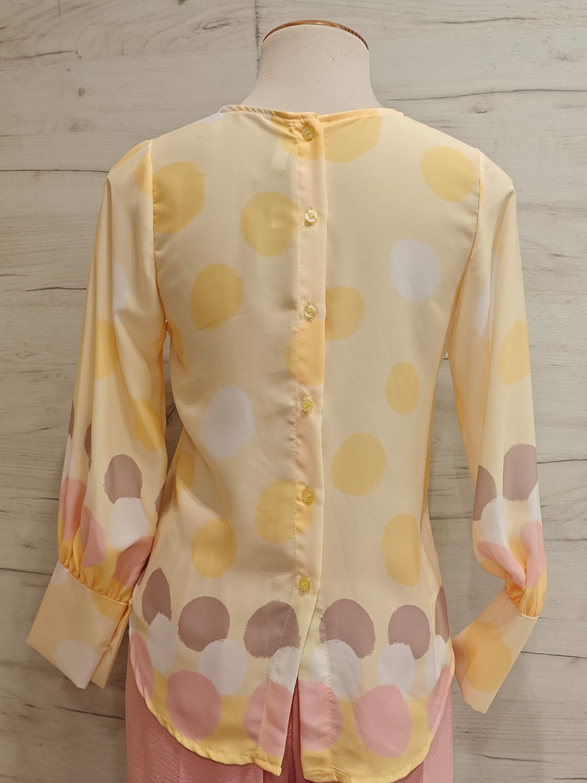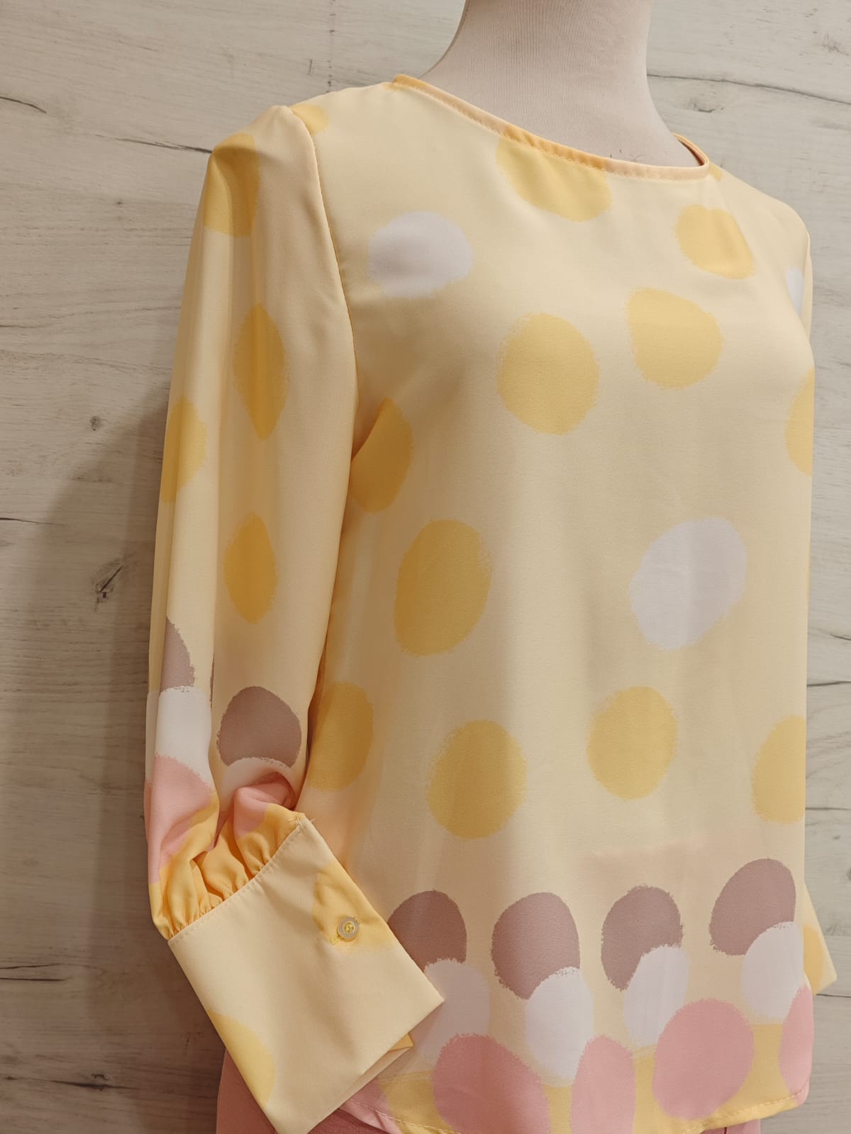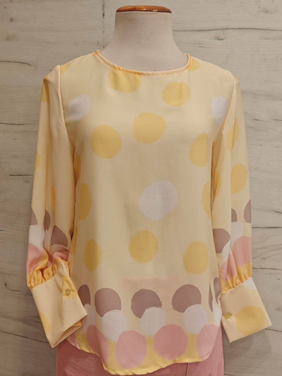 Blusa de tela en color amarillo con decoración de topos grandes y difuminados en color blanco , beige y rosa con hombro sentado y manga larga con un puño grande con cierre de botón con posibilidad de doblarlo, con cuello redondo. Parte trasera toda abotonada.
