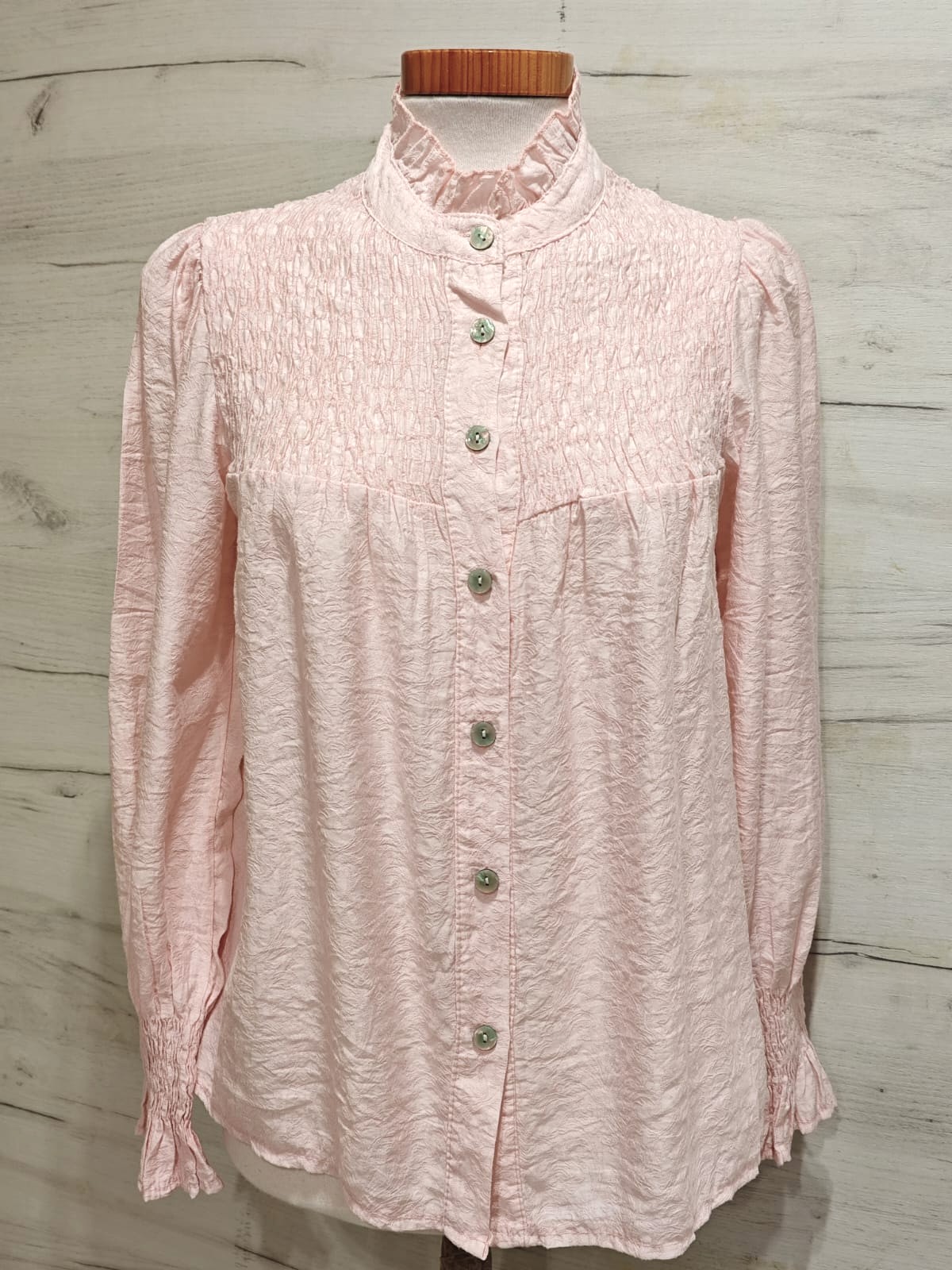 Blusa rosa con parte superior fruncido y cuello ligeramente subido con acabado ondulado y botones delanteros. Manga larga amplia con puño fruncido terminado en volante.