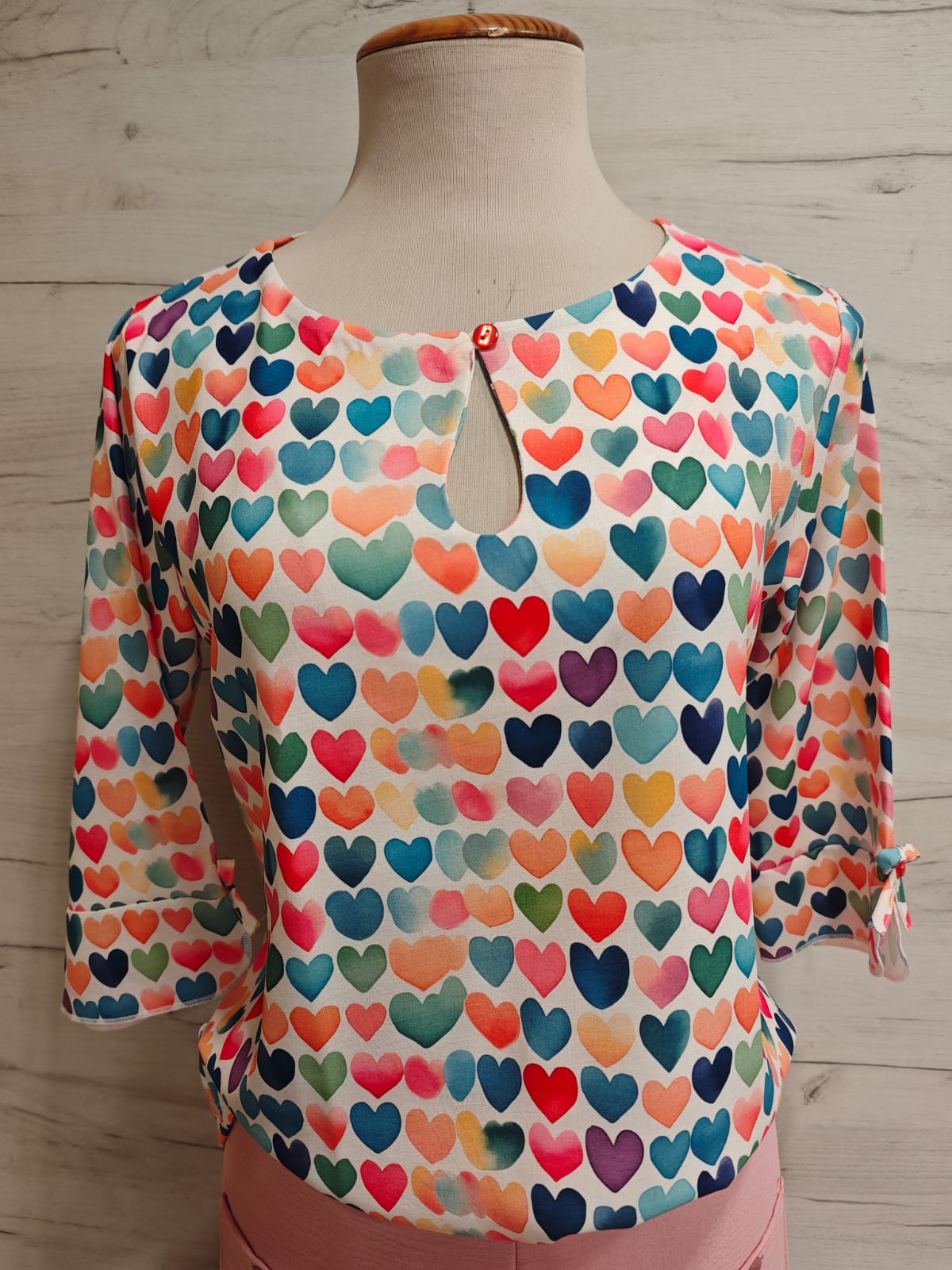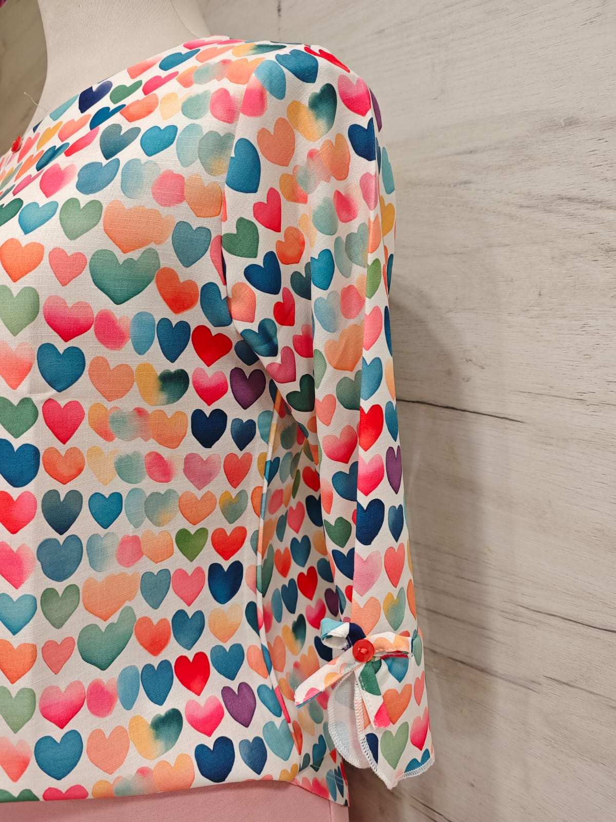 Blusa de tela con corazones de colores de hombro sentado con cuello redondo y un cierre delantero en forma de lagrima con un cierre con un botón. Media manga con puño acabado en volante con un bonito detalle con un lazo y un botón.