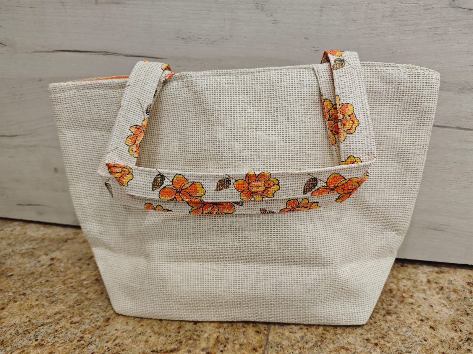 Bolsa de playa de sarga (tipo saco) con decoración de lazo y cuerdas exterior. Con asas resistentes decoradas, colores naranjas con flores y rayas. Interior forrado con un bolsillo y cierre con cremallera.