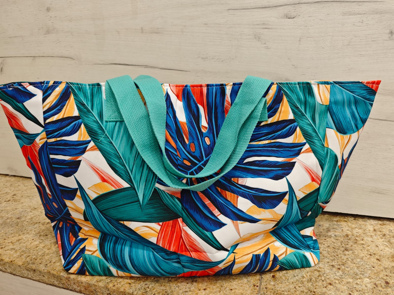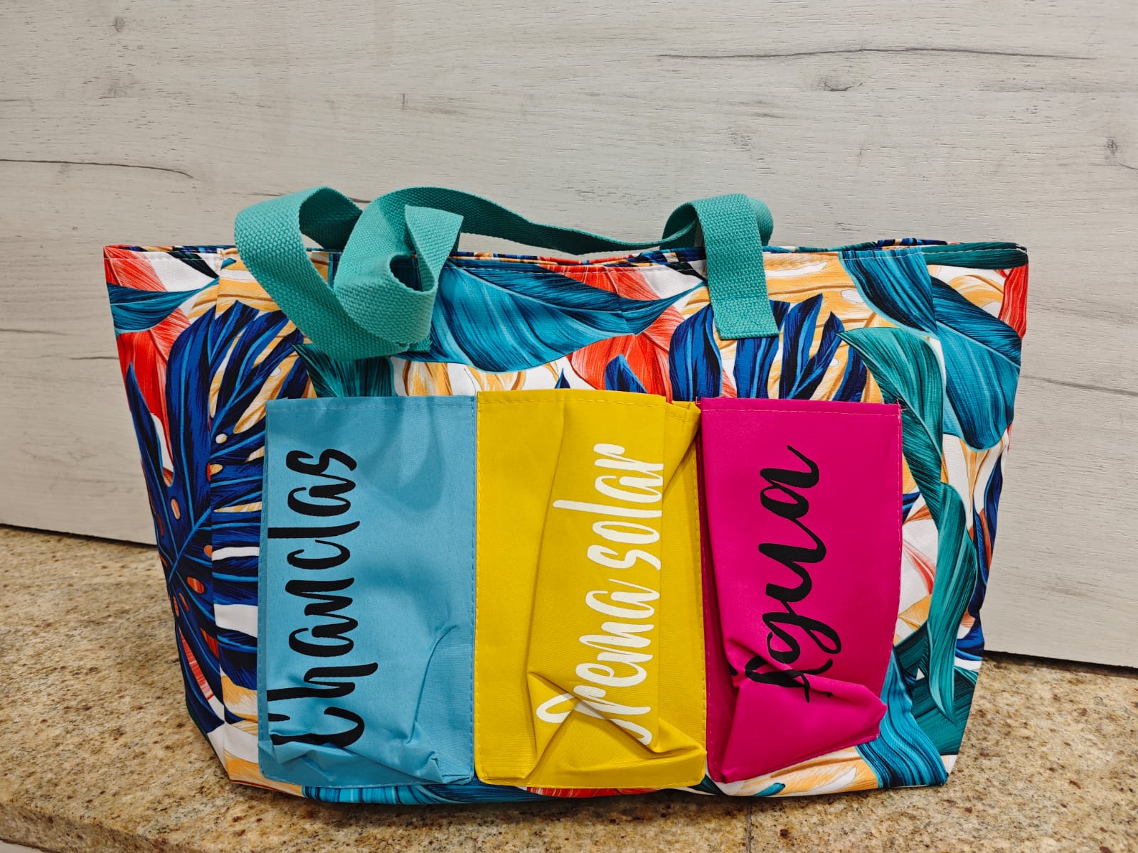 Bolsa de playa con tres bolsillos en el exterior delantero para chanclas, crema solar y agua. Con asas resistentes de color turquesa, muy colorida con hojas de palmera de colores. Interior forrado con un bolsillo y cierre con cremallera.