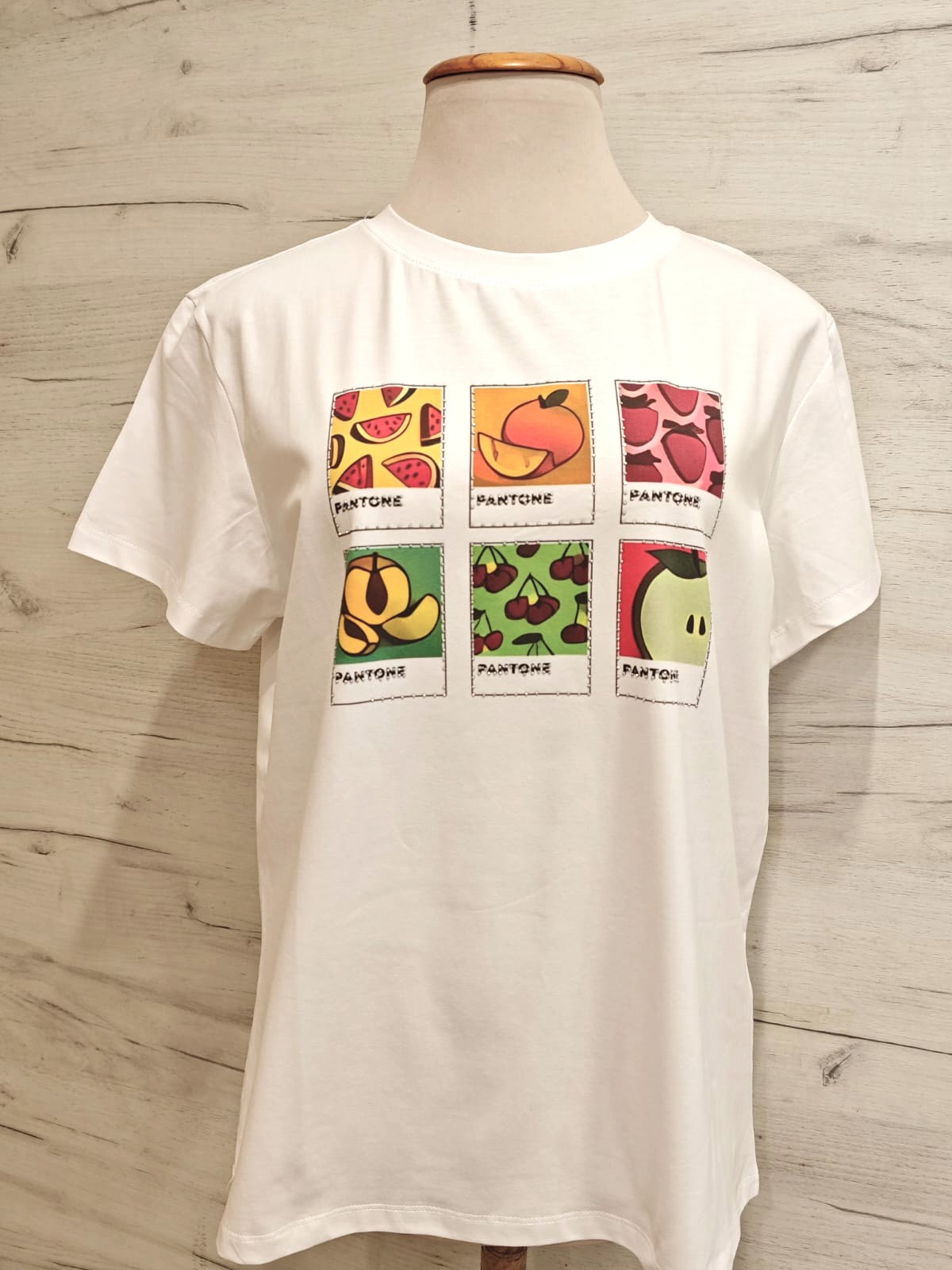 Camiseta blanca con cuello redondo y con manga corta. Estampado delantero centrado con diseño de frutas bordeadas con brillos en seis cuadros estilo Pantone en colores.