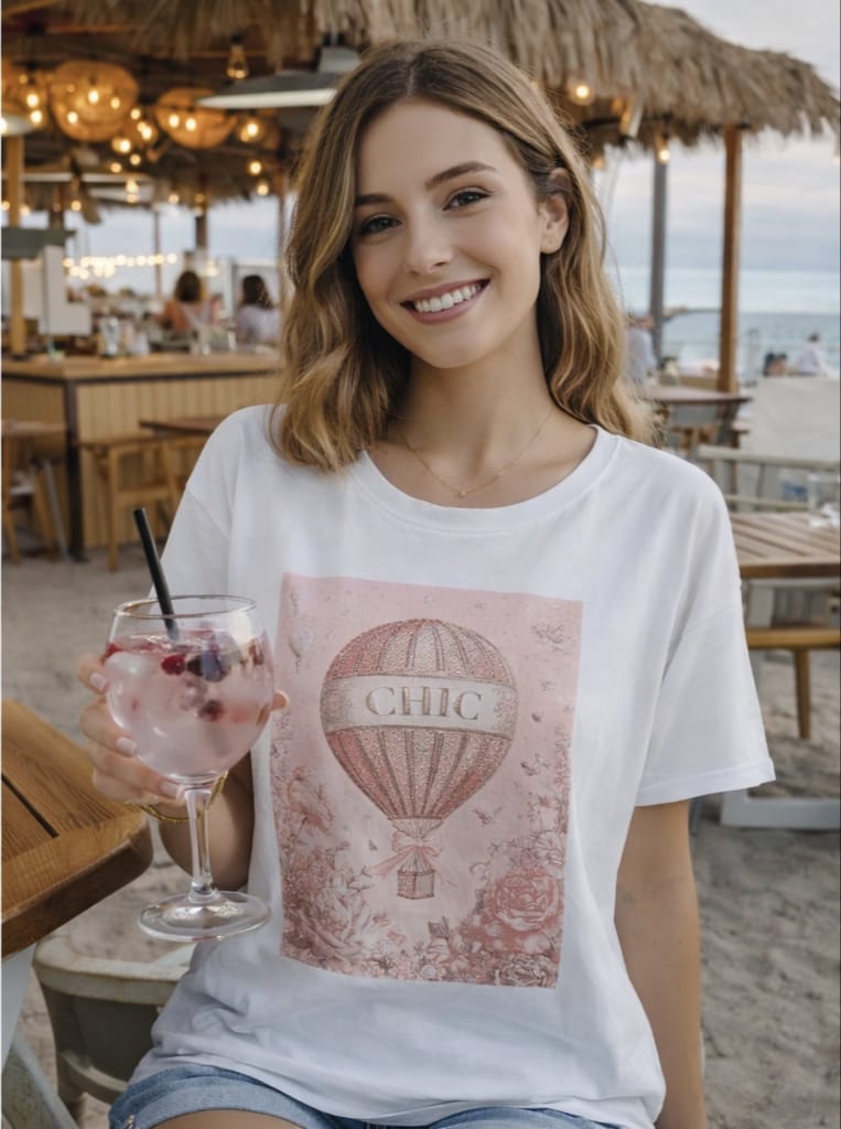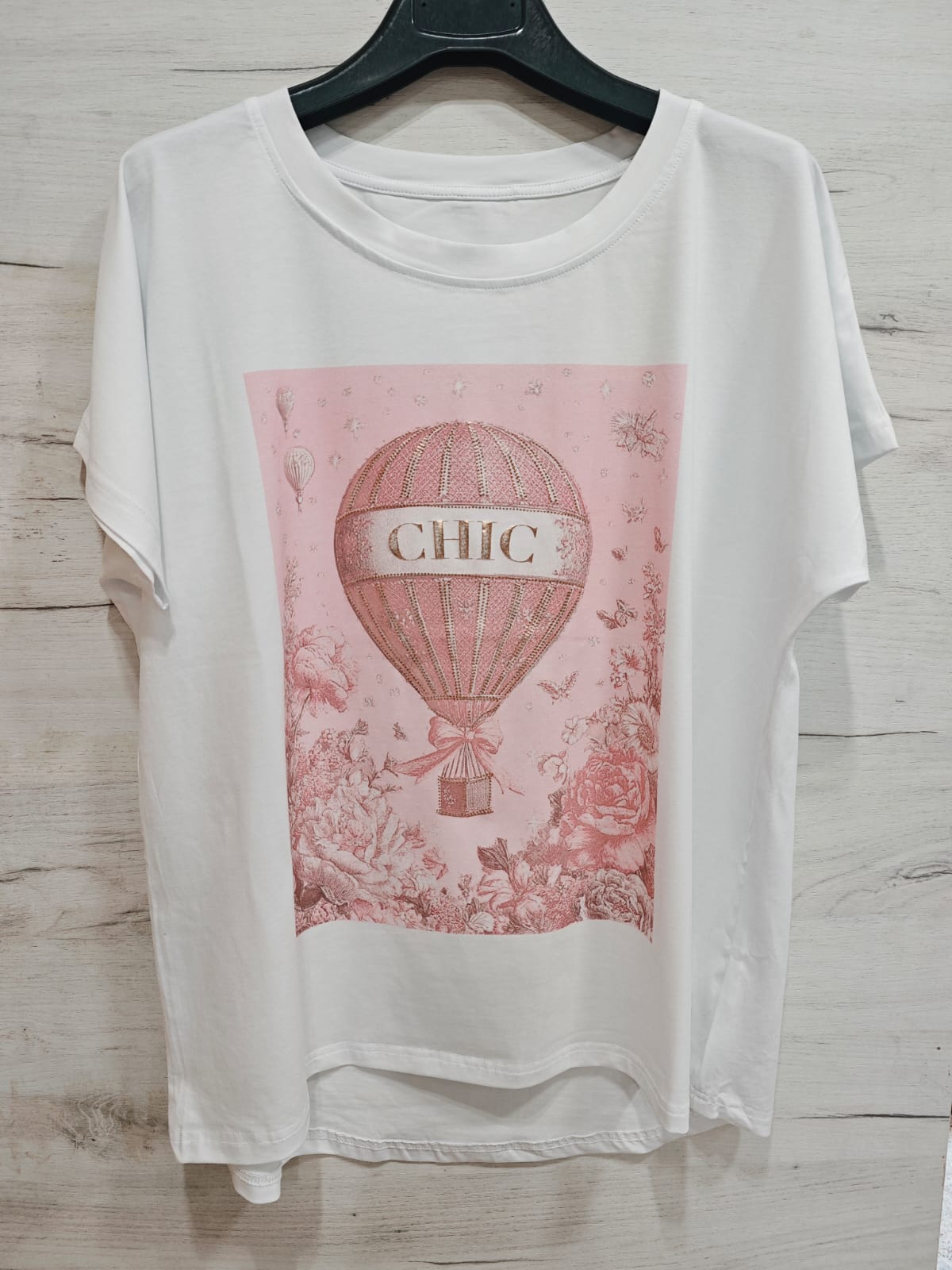 Camiseta blanca con cuello redondo y con manga corta. Mas larga por detrás. Estampado delantero en tonos rosas con un globo con decoración chic bordeado con detalle de flores.