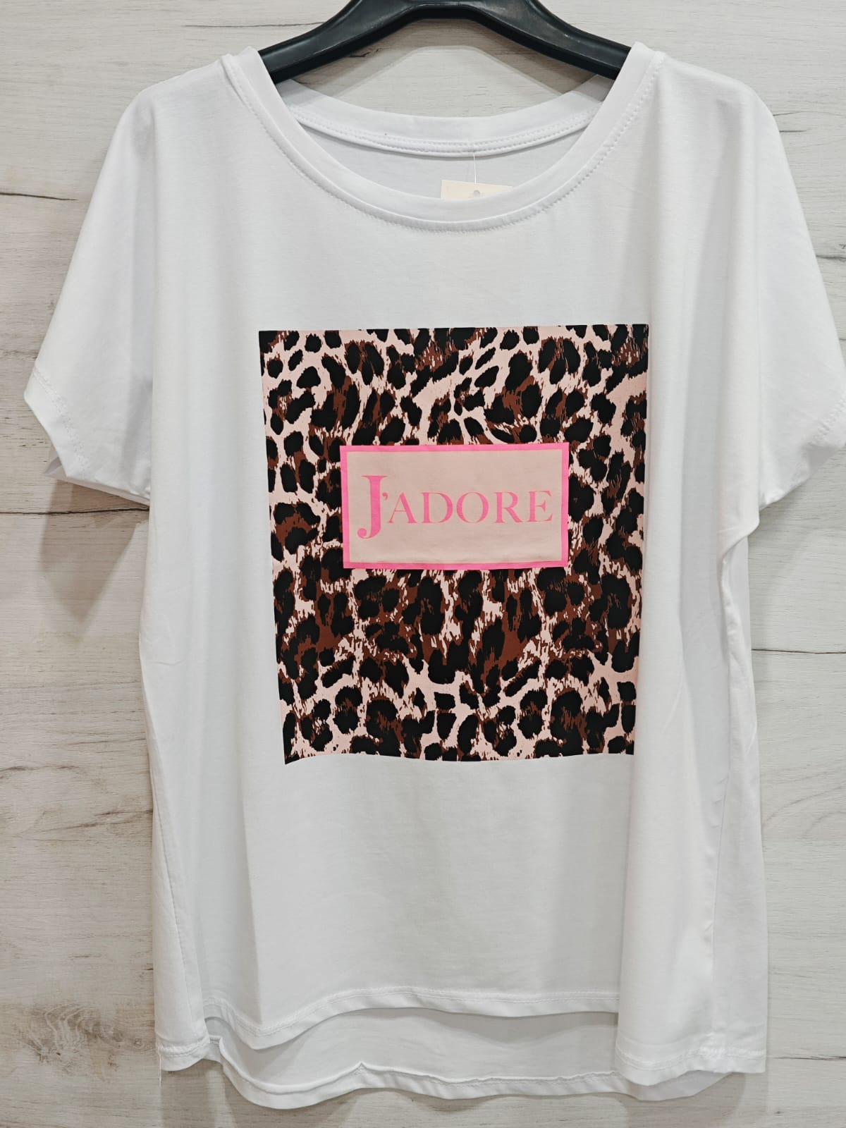 Camiseta blanca con cuello redondo y con manga corta. Mas larga por detrás. Estampado delantero en tonos rosas con animal print con letras j´adore en rosa.