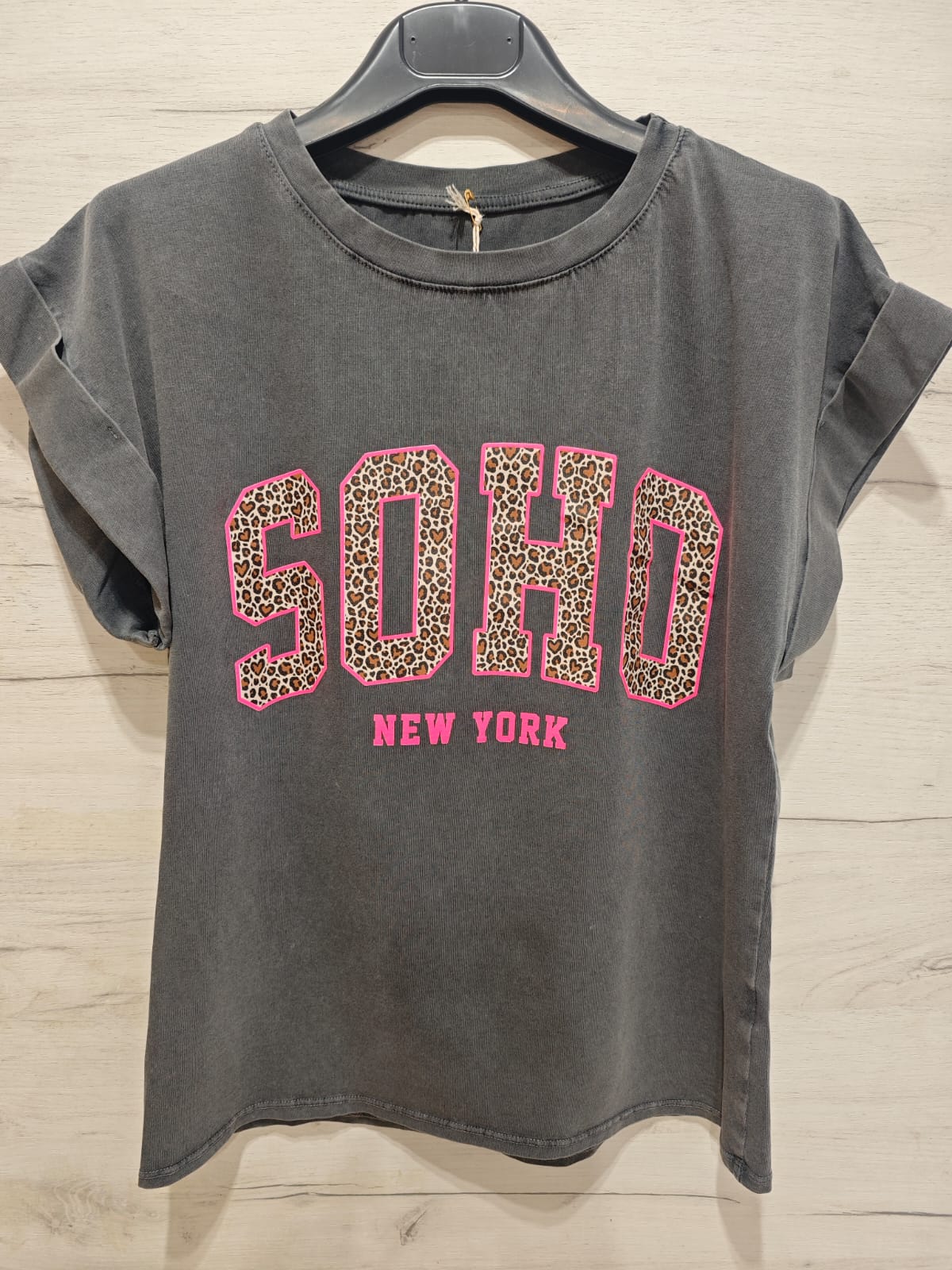 Camiseta gris efecto lavado con cuello redondo y con manga corta con detalle doblado. Estampado delantero grande con letras SOHO en rosa y animal print.