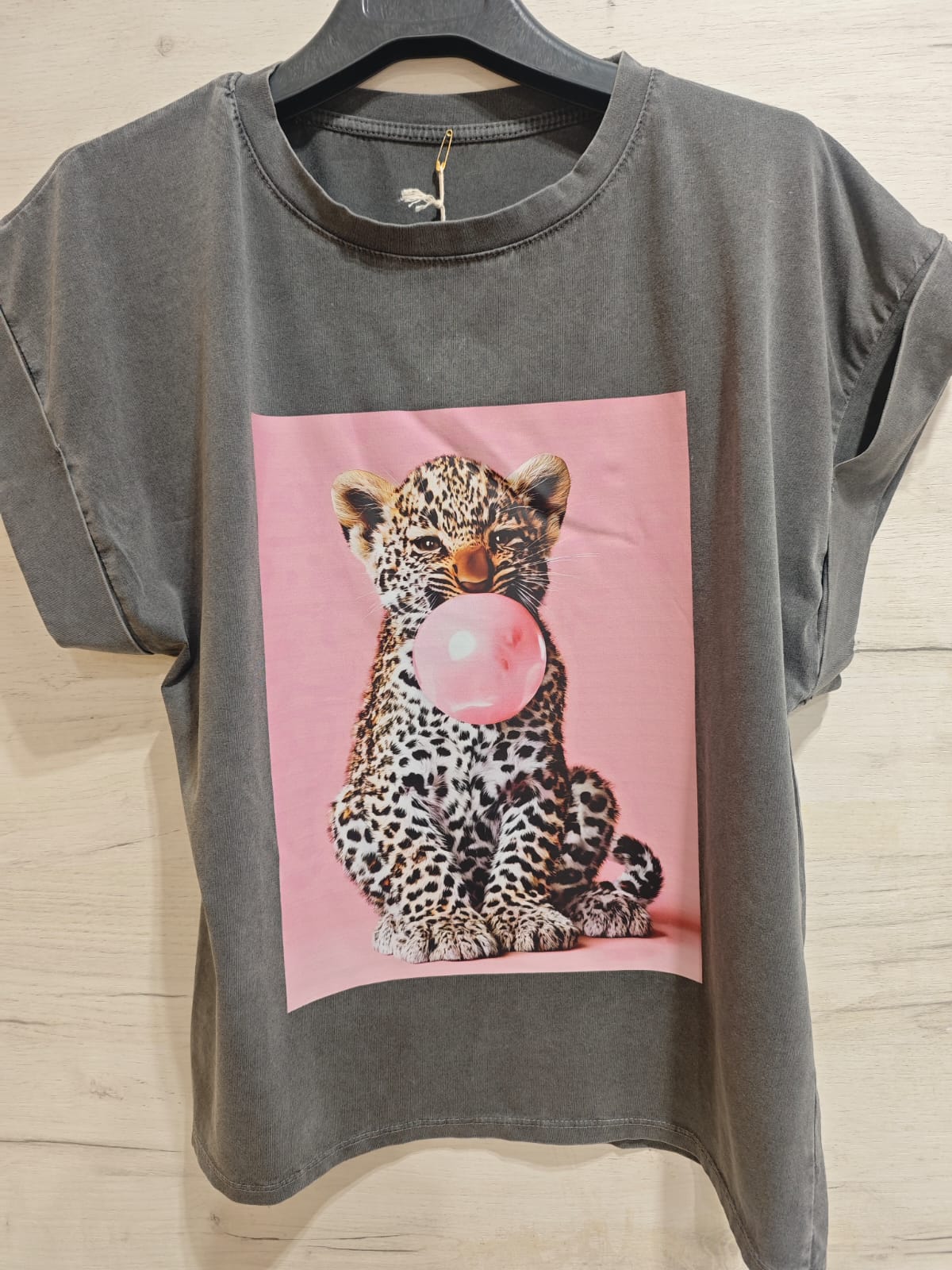 Camiseta gris efecto lavado con cuello redondo y con manga corta con detalle doblado. Estampado delantero grande con fondo rosa y con un tigre bebe con una ponpa de chicle rosa.