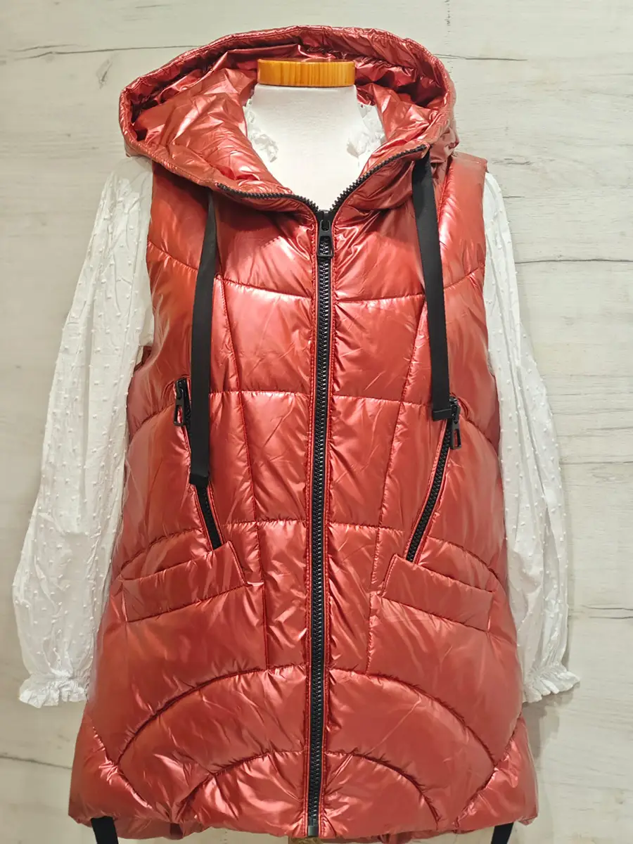 Chaleco metalizado color bronce, acolchado con capucha, cierre con cremallera delantera, capucha con cordones ajustables.