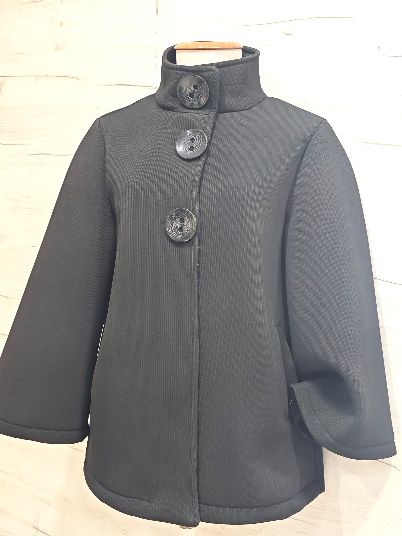 Chaqueta negra de tejido neopreno , diseño en capa y acabado limpio. Presenta cuello subido envolvente, cierre frontal con tres botones maxi decorativos en contraste y costura central trasera. Incorpora bolsillos laterales discretos, manga larga ancha y bajo con efecto capa.