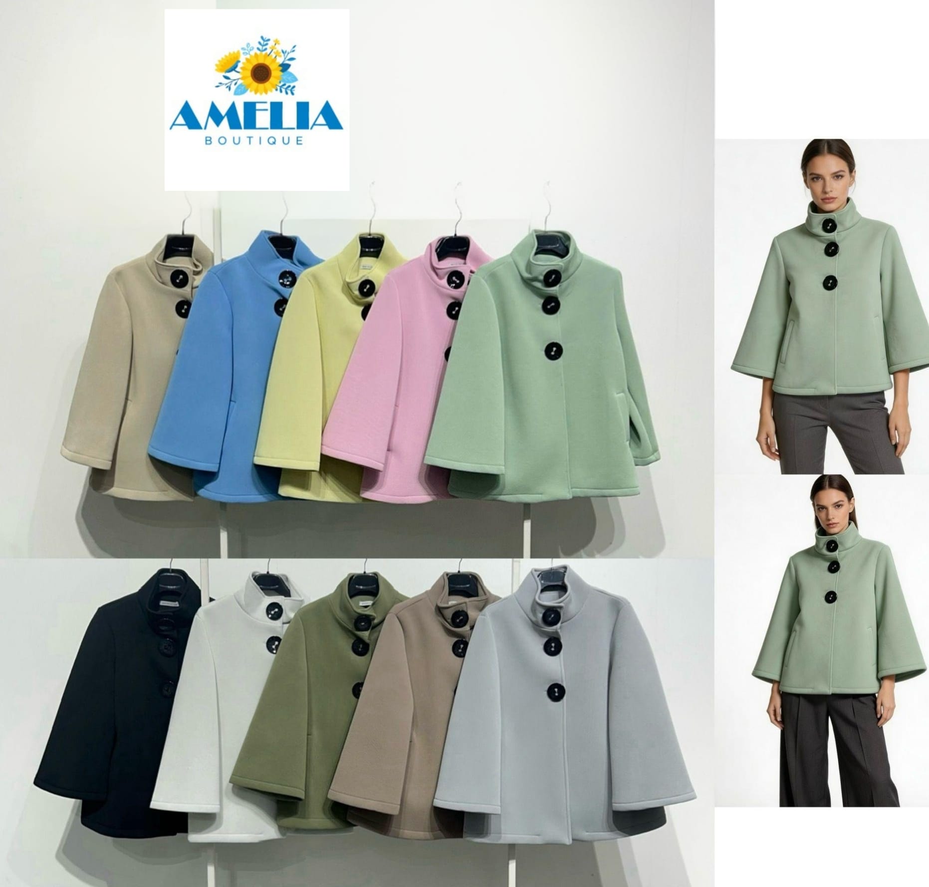 Chaqueta rosa de tejido neopreno , diseño en capa y acabado limpio. Presenta cuello subido envolvente, cierre frontal con tres botones maxi decorativos en contraste y costura central trasera. Incorpora bolsillos laterales discretos, manga larga ancha y bajo con efecto capa.