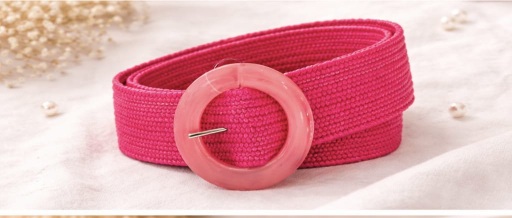 Cinturón resistente y elástico de color verde. Proporciona una hebilla de nácar también en fuxia con un cierre firme y ajustable sin necesidad de perforar el cinturón ya que permite cerrarlo según tamaño.