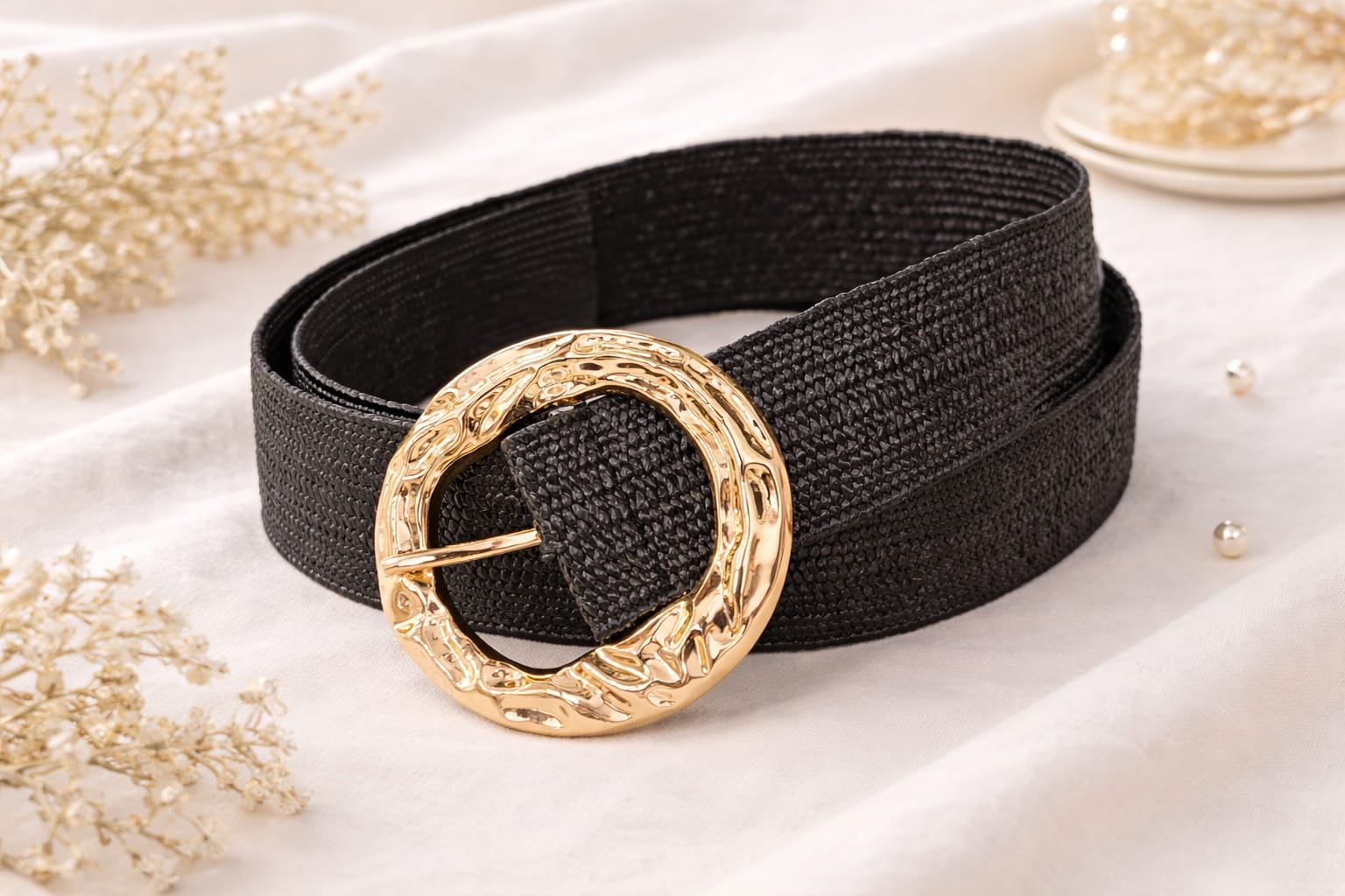 Cinturón resistente y elástico de color negro. Proporciona una hebilla grande dorada con un cierre firme y ajustable sin necesidad de perforar el cinturón ya que permite cerrarlo según tamaño.