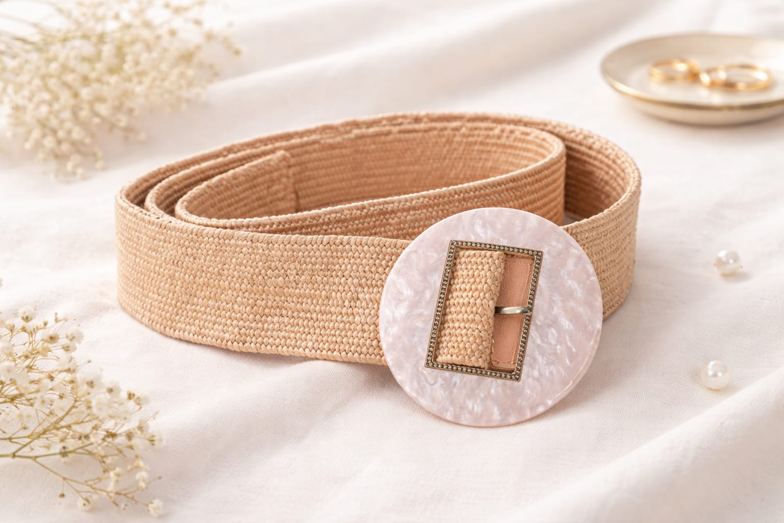 Cinturón resistente y elástico de color rosita. Proporciona una hebilla de nácar en tonos rosas con un cierre firme y ajustable sin necesidad de perforar el cinturón ya que permite cerrarlo según tamaño.