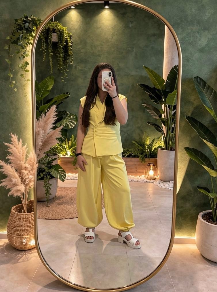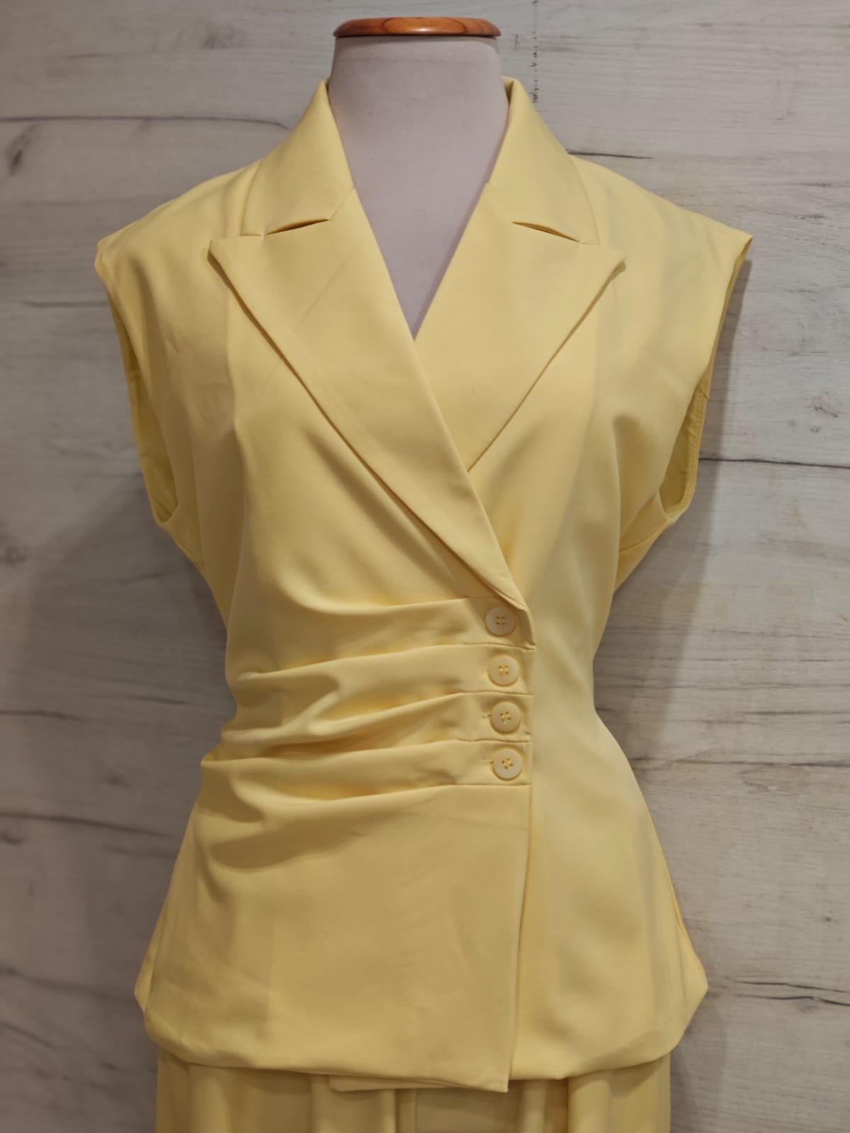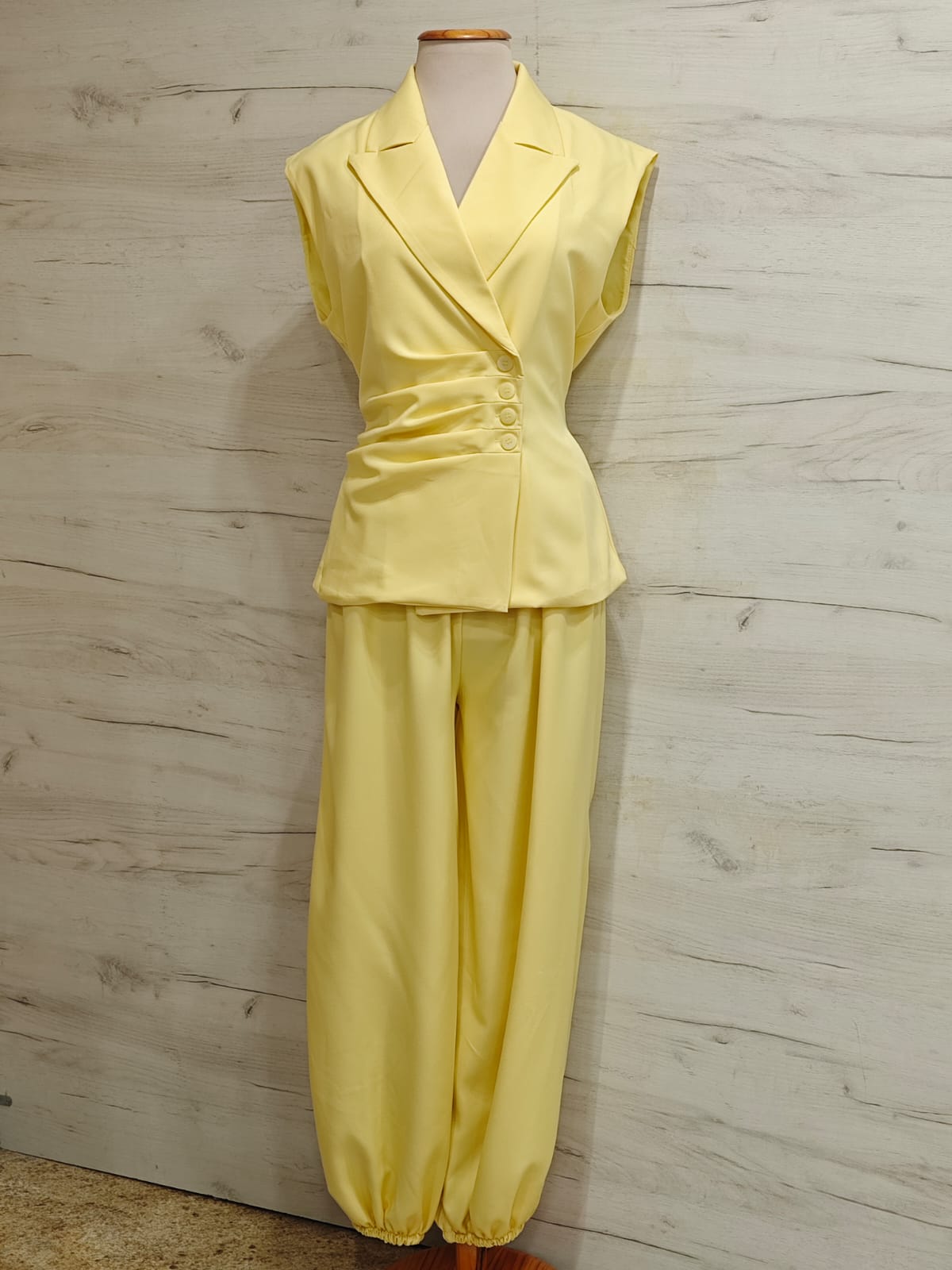 Conjunto de pantalón tipo bombacho en color amarillo con gomas en los tobillos y cintura trasera con goma.