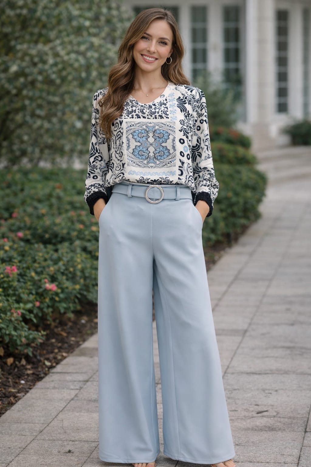 Pantalón de pierna ancha  con cintura con goma  y por delante cinturón con hebilla decorativa,  bolsillos laterales y tela muy suave.