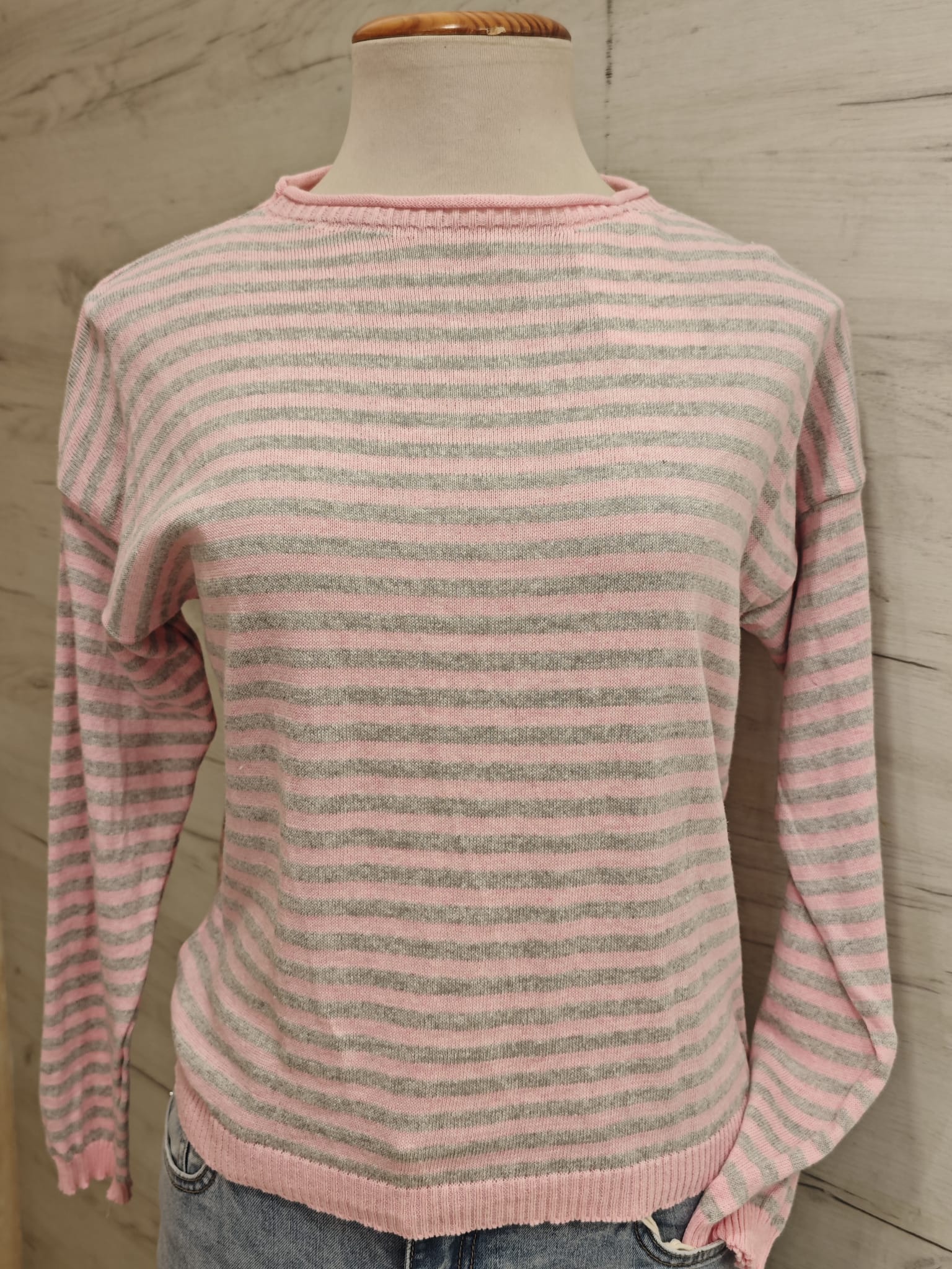 Jersey de rayas finito de color rosa y gris con manga larga, hombro caído y cuello redondo. Detalle de canalé en cuello, puños y bajo.