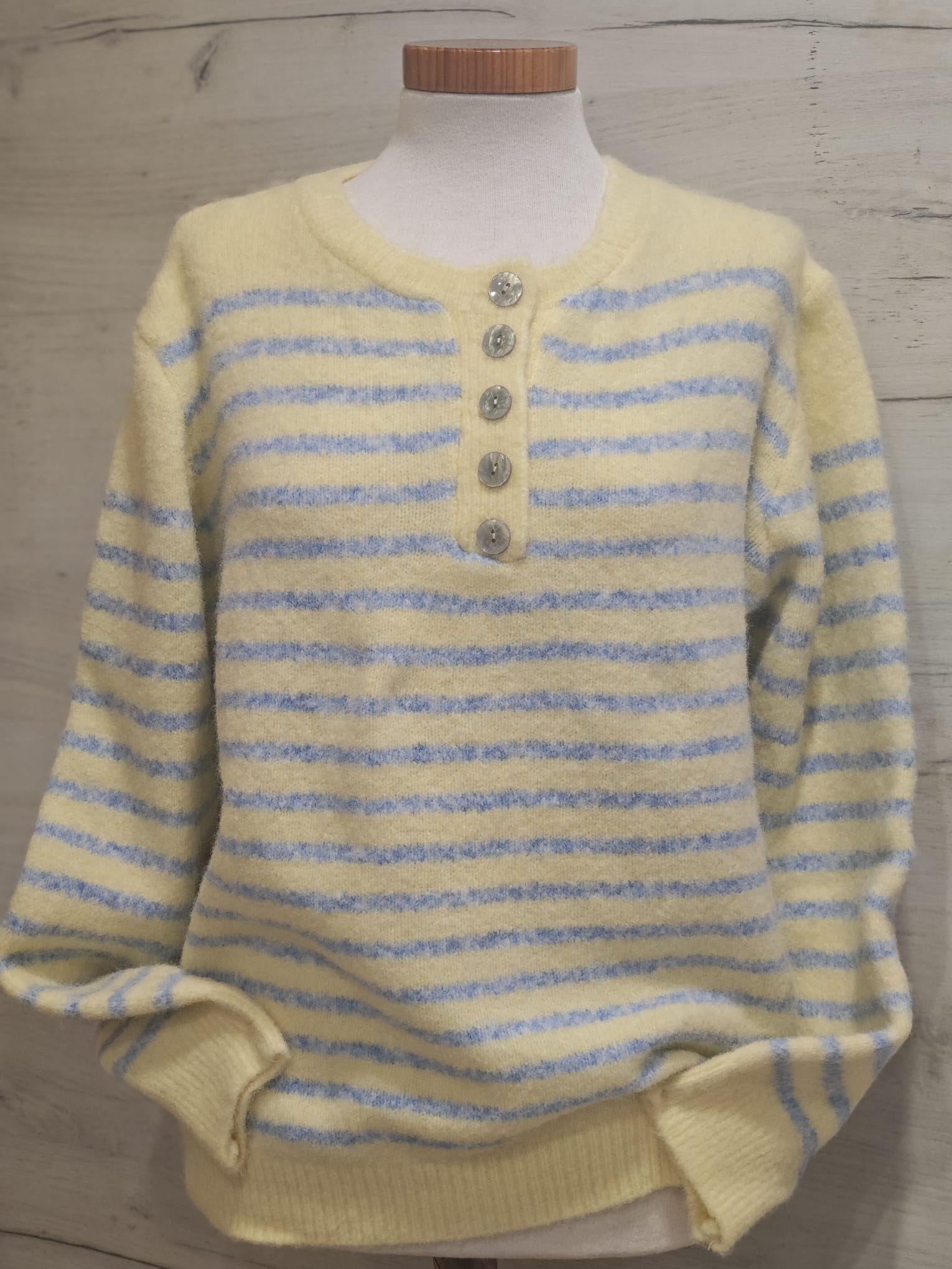 Jersey de rayas con cuello redondo y detalle de botones en el delantero. Acabados en canale en cuello, puños y bajo.