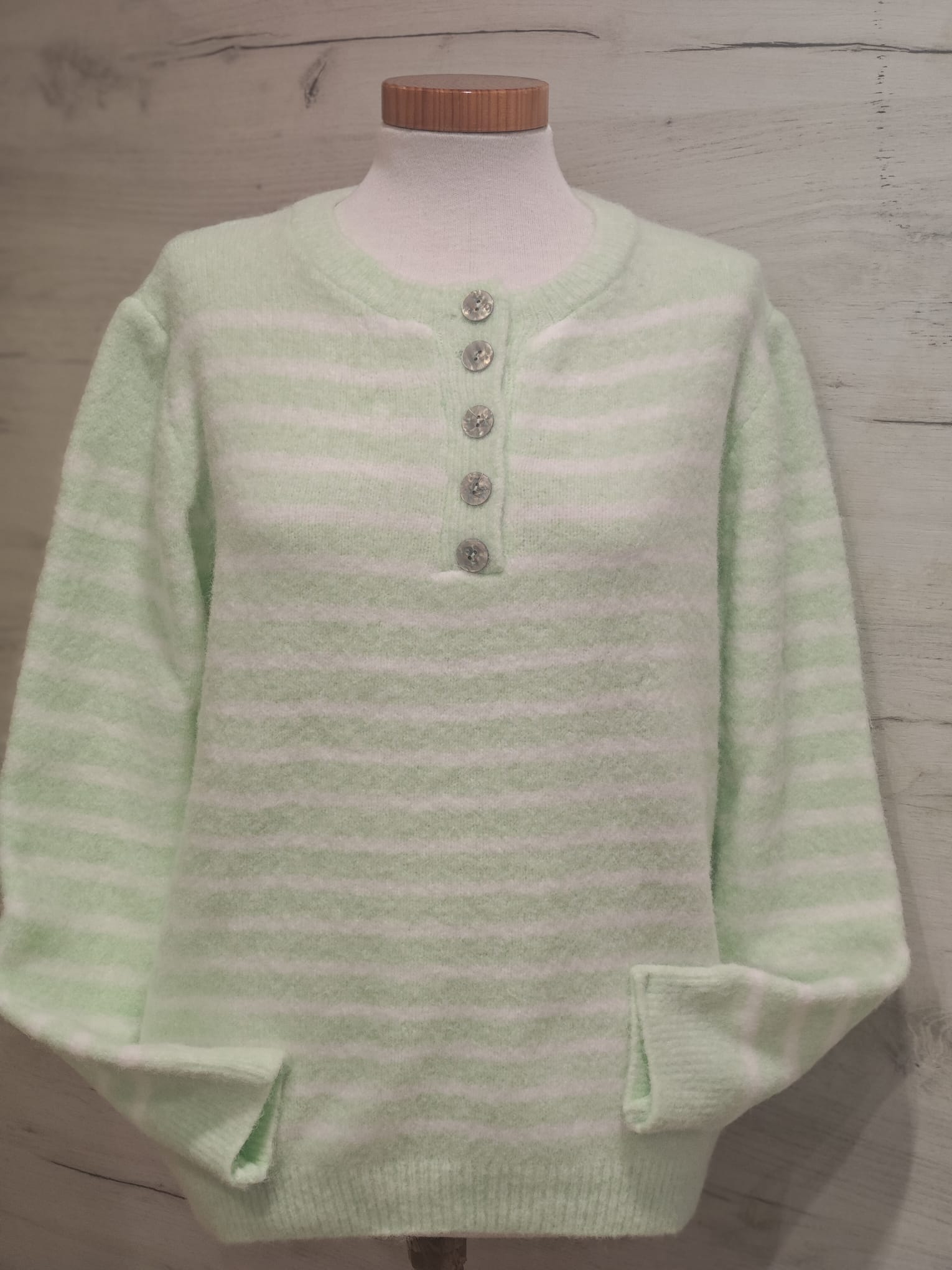 Jersey de rayas con cuello redondo y detalle de botones en el delantero. Acabados en canale en cuello, puños y bajo.