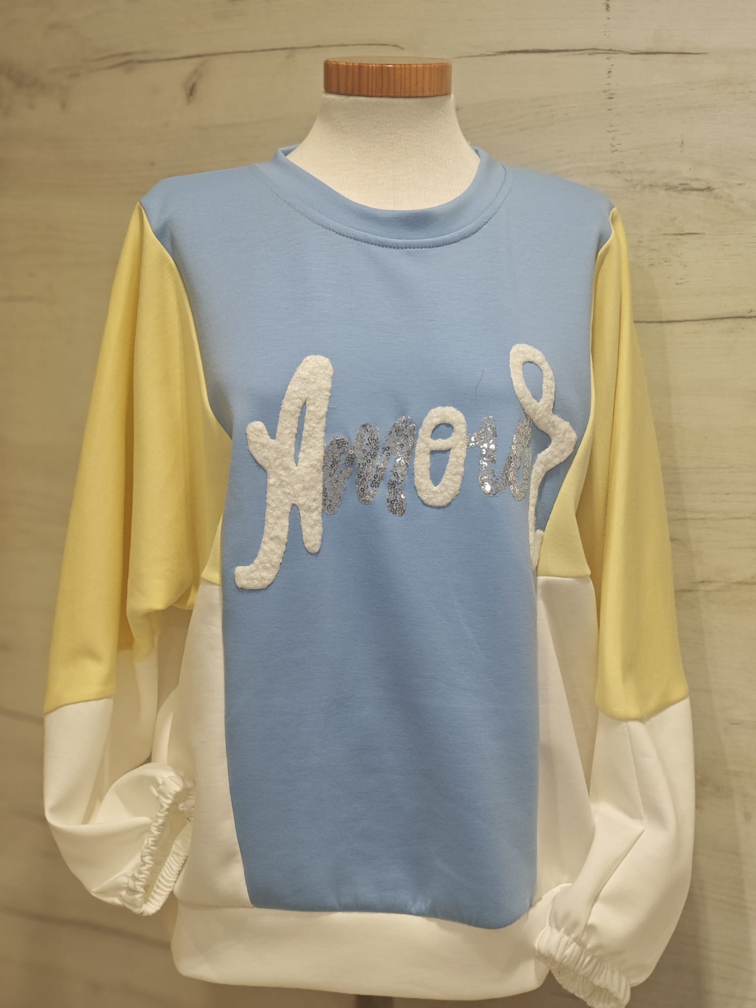 Sudadera tricolor con delante amour en relieve y brillo en el frontal manga amplia con puño fruncido y acabado cómodo.