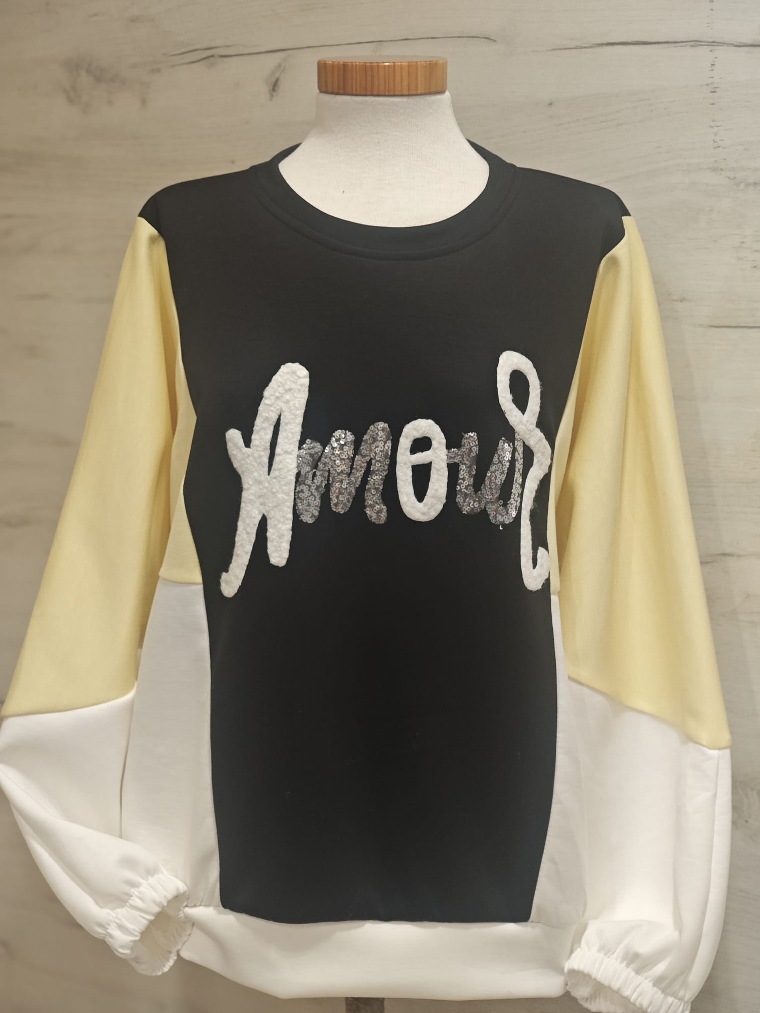 Sudadera tricolor con delante amour en relieve y brillo en el frontal manga amplia con puño fruncido y acabado cómodo.