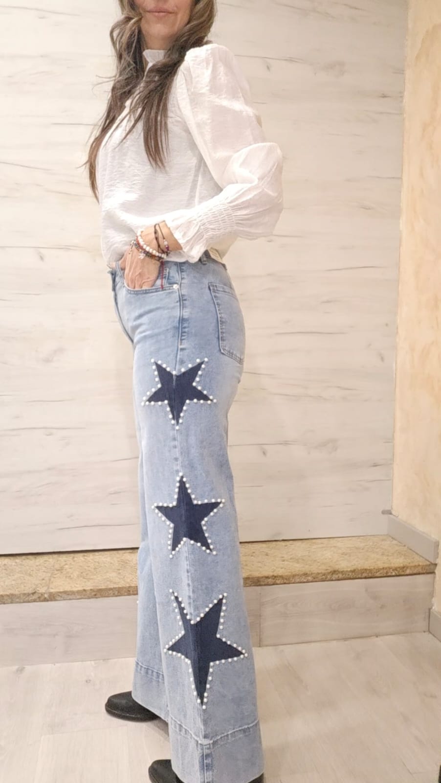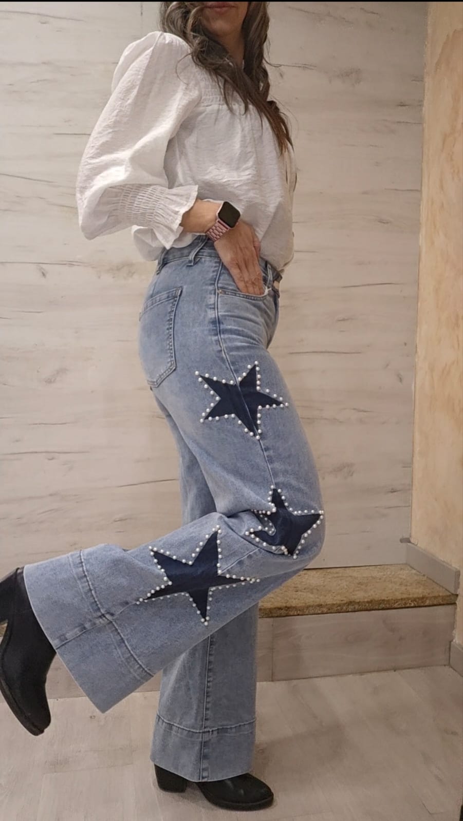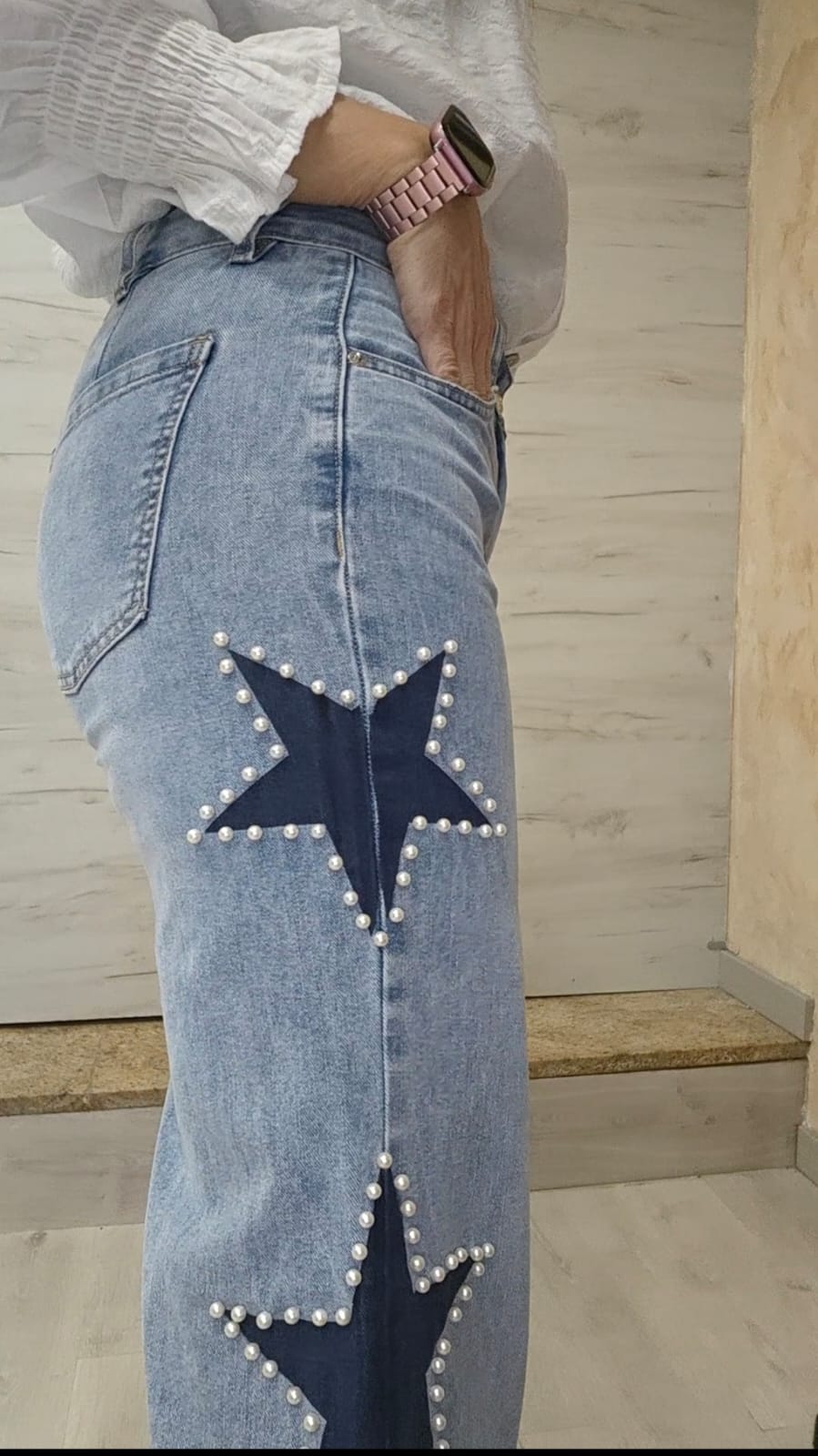 Pantalón vaquero claro ancho recto de talle medio/alto con cinco bolsillos, cremallera y botón metálico. Elástico muy cómodo y suave. Decorado con estrellas oscuras en los laterales de las piernas decoradas con perlas blancas.