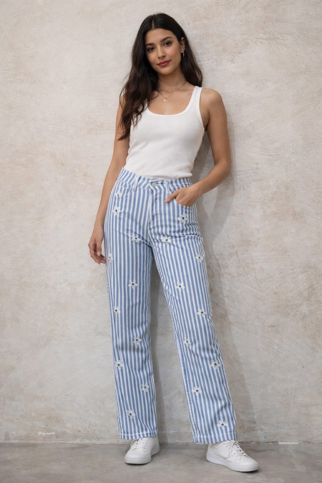 Pantalón vaquero ancho de talle medio con cinco bolsillos, cremallera y botón metálico. Elástico muy cómodo y suave. Decorado de rayas en blanco y azul y flores en blanco bordadas.